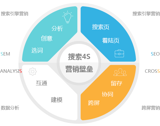 随着互联网技术的日新月异的发展,SEM营销在互联网整合营销中起到了非常重要的“收口”作用。 SEM服务也从初期的个人经验主义阶段演变到了先进的优化分析工具与经验丰富的分析师共同配合的阶段。 ZHIXUN TECH根据多年的经验,总结出以SEM为基础,以数据为支撑,SEO做补充,跨屏做延展的4S营销壁 垒模型。全方位多角度的覆盖目标用户,最终实现用户转化并刺激用户分享,产生传播裂变化的效果。